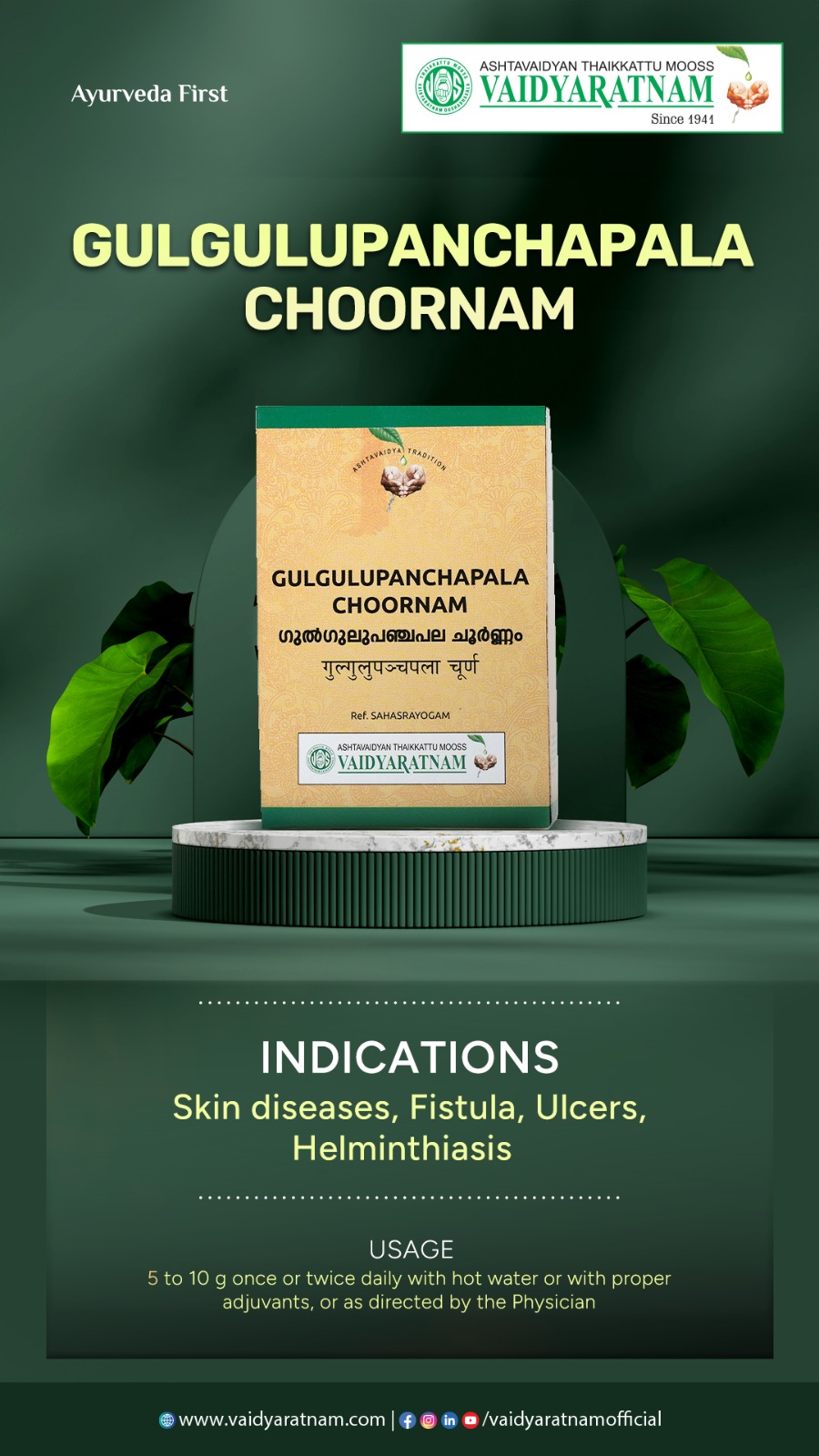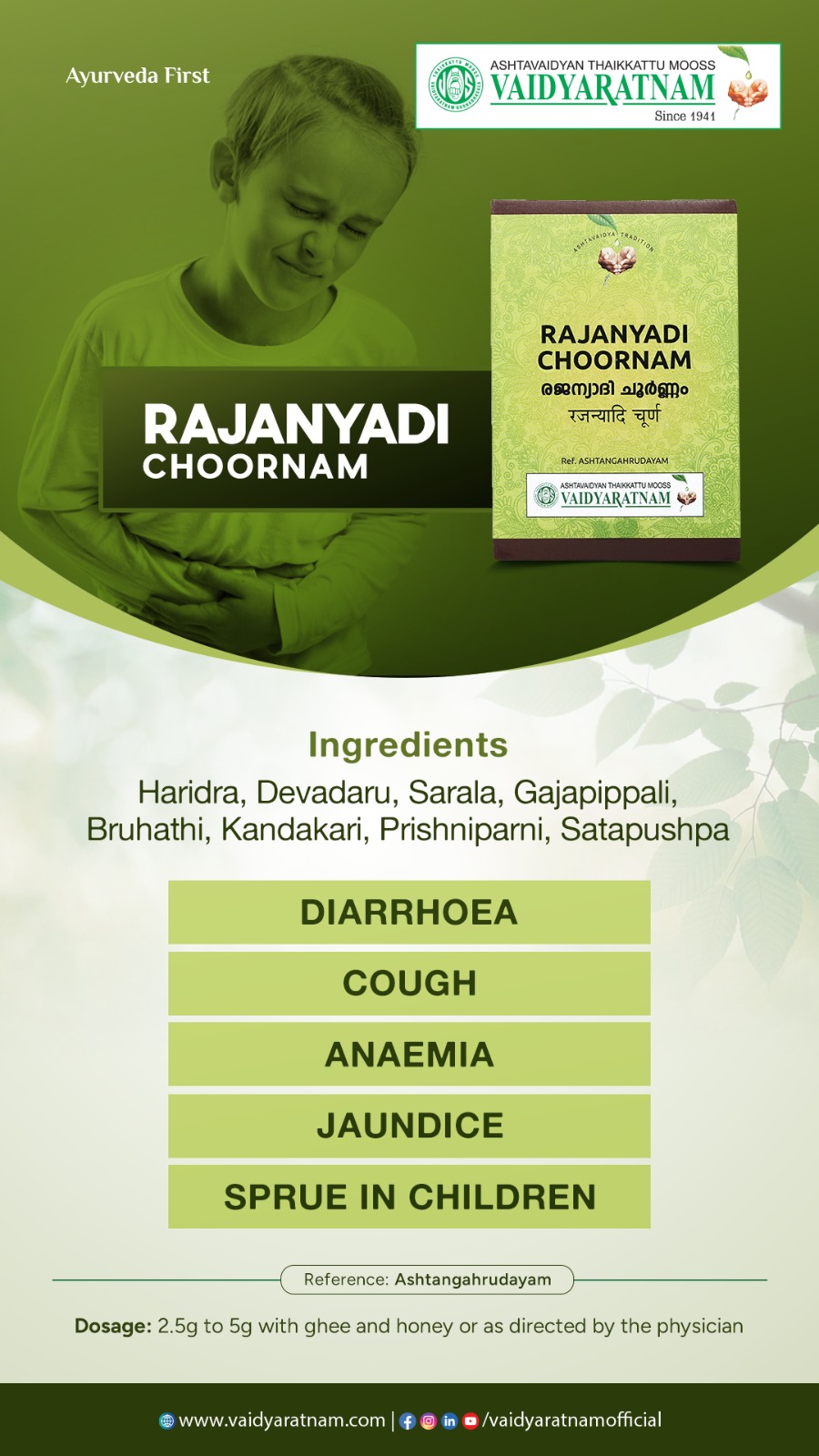 ഗുണങ്ങൾ : ദഹനം മെച്ചപ്പെടുത്തുന്നു, മലബന്ധം കുറയ്ക്കുന്നു, ത്രിദോഷങ്ങളെ സന്തുലിതമാക്കുന്നു.