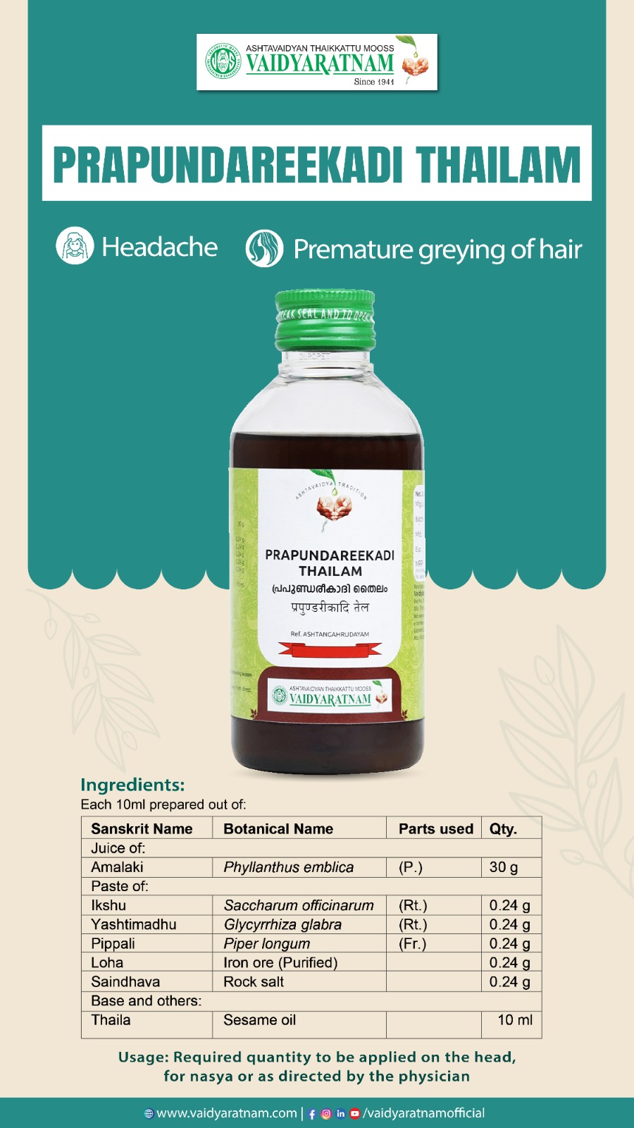 ഗുണങ്ങൾ :മുടികൊഴിച്ചിൽ, താരൻ, അകാലനര, എന്നിവയ്ക്ക് ഉപയോഗിക്കാവുന്നതാണ്.